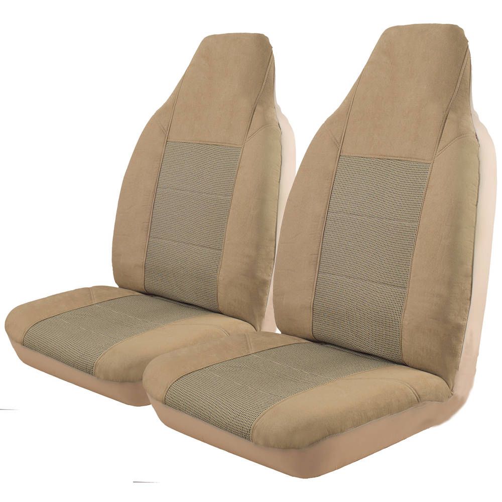 Universal size high back bucket seat with and integrated or molded head rest. These seat covers fit over the headrest in one piece