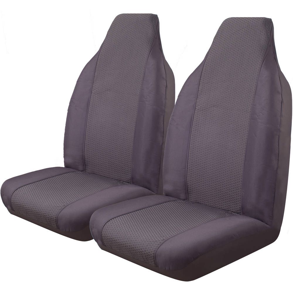 Universal size high back bucket seat with and integrated or molded head rest. These seat covers fit over the headrest in one piece