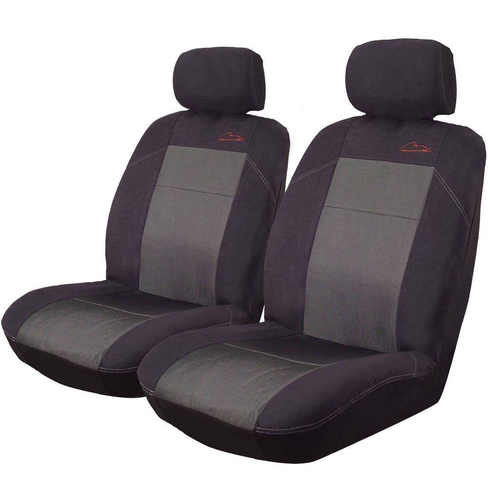 A sporty looking seat cover made from imitation suede fabric with exposed double stitching. A small embroidered insignia is located on the top left shoulder of the seat cover. The middle panel is made from a metallic look mesh with polyester back and sides.